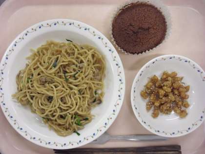 <塩焼きそば・大豆とじゃこの甘辛あげ・おからマフィン・牛乳>