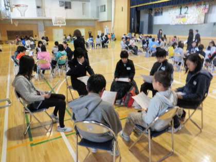 「書く力」「伝える力」を育成するために、小学校高学年と中学校で共通に取り組んでいる新聞コメントをもとに、児童生徒が意見交換・発表して交流を深めました。