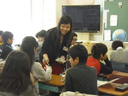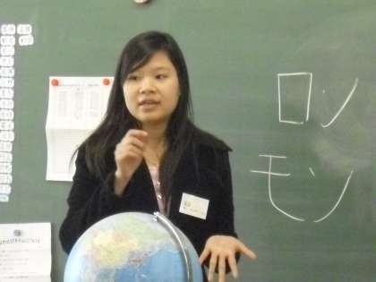 地図で、ミャンマーの位置を確認し、あいさつや文字を教えていただきました。輪ゴムでつくる星を教わり、友達と教え合いながら、楽しそうに作りあげていました。