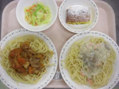 ★リザーブ給食 <スパゲティナポリタンorシーフードクリームソース・キャベツサラダ・かぼちゃのケーキ・牛乳>