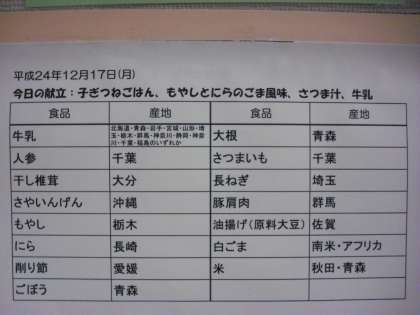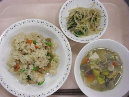 <子ぎつねごはん・もやしとにらのごま風味・さつま汁・牛乳>