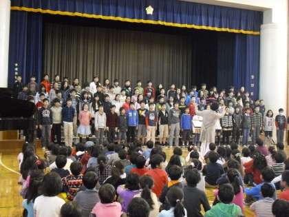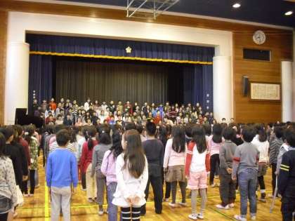 最後に、6年生の校歌の合唱を聞いてから、全校で校歌を合唱しました。体育館に子どもたちの歌声が響き渡りました。