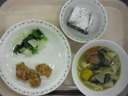<かぼちゃほうとう・鶏のから揚げ・かぶのゆず漬・ブラウニー・牛乳>