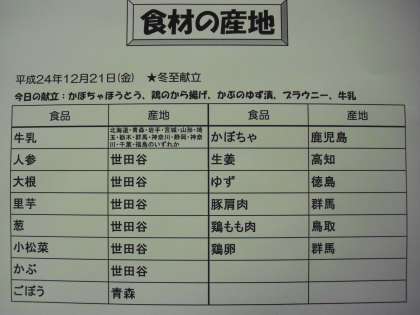 今日は冬至なので、かぼちゃほうとうと旬のかぶのゆず漬を食べました。今日は、世田谷そだちの旬の野菜をたくさんいただきました。また、昨日今日は2年2組がランチルームで、みんなが好きなブラウニーもおいしくいただきました。給食を作ってくださった調理員の方々、2学期の給食をありがとうございました。