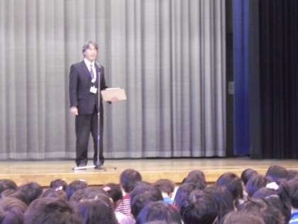はじめに、吉村実校長が、今学期を振り返り、各学年の学習や行事等で努力した点をたたえ、代表児童の通知表の所見を読み上げました。そして、冬休みを大切に過ごして、元気に始業式に登校し、3学期も自分の目標を設定し、努力してほしいと話しました。