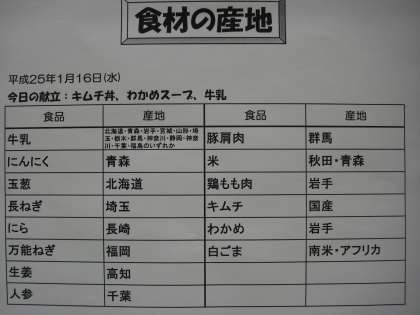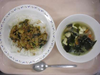 今日は久しぶりのキムチ丼です。子どもたちにもわりと人気があり、必ずリクエストにあがる献立の一つです。給食のキムチ丼は、あまり辛くなく甘めな味になっています。わかめは、私たち日本人には欠かせない食べ物です。わかめにはヨウ素が多く含まれているので、わかめをよく食べる日本では不足することがない栄養素であると言われています。