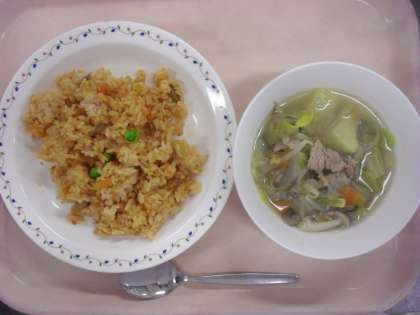 トマトケチャップ系のライスは、子供も大人も好きなようです。給食のチキンライスは、お米にトマトジュースを入れて炊きます。具のほうには味付けにトマトケチャップを使用し、炊いたごはんと別に作った具を混ぜ合わせる混ぜごはんです。スープもおいしくいただきました。