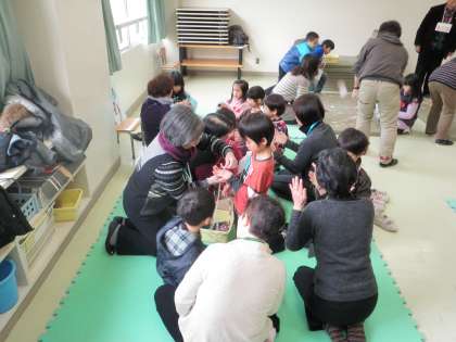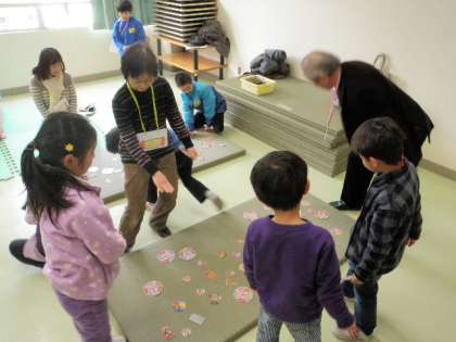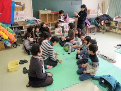 近隣保育園の体験入学は、豪徳寺保育園(2/14)、春明保育園(2/14)、赤堤保育園(2/19)、河田保育園(2/19)、経堂保育園ひだまり分室(2/22)が来ます。写真は、めんこ、お手玉、あやとりの様子です。