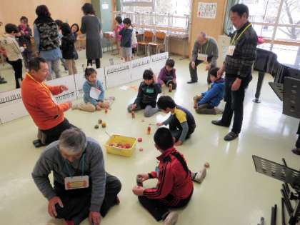 体験入学は、個人でもお受けしますので、ホームページのお知らせをご覧ください。写真は、けん玉、だるま落としの様子です。