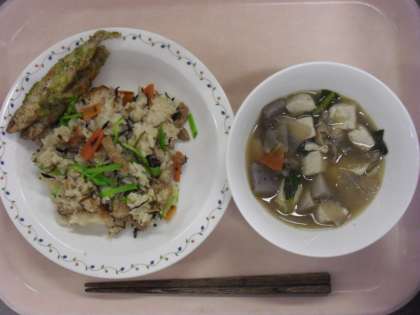 <磯おこわ・わかさぎの磯辺揚げ・みちのく汁・牛乳>