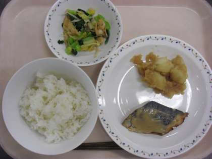 <ごはん・さわらの西京焼き・きのこ入り煮浸し・じゃがいもの甘辛煮・牛乳>