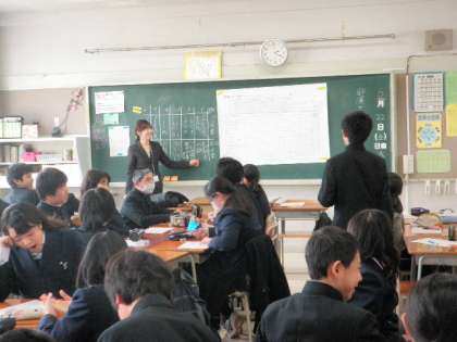 <感  想>皆協力して話し合いをしていたことからも分かるように、クラスの雰囲気がよく授業しやすかった。赤小出身者が半分位で、とてもなつかしく、授業中もたくさん発言してくれたり質問してくれたりして、うれしい気持ちで授業した。また赤小出身以外の生徒達も積極的に参加してくれたのがよかった。