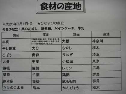 3月3日は桃の節句ひな祭りです。給食では今日ひなまつりのお祝いをしました。菜花(なばな)は今が旬で、ビタミンCやカロテンが豊富に含まれ、カルシウムや鉄分も多い青菜です。