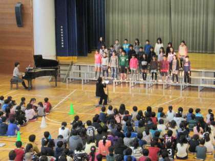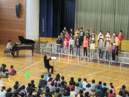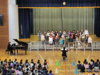 4年は「風のメロディー」斉唱、「レッツダンス」2部合唱、5年は「スキーの歌」斉唱、「翼をください」2部合唱、6年は「春よ、来い」斉唱、「最後のチャイム」2部合唱でした。写真は、4-1、5-1、6-1の発表の様子です。