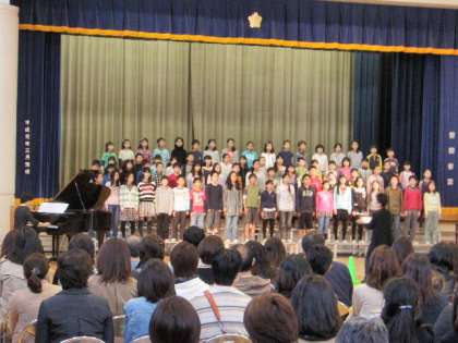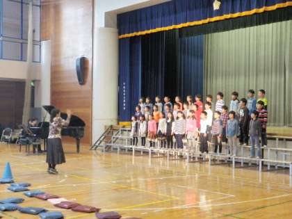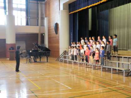 中休みに合唱団の歌声を聞いていただきました。合唱団員がリーダーシップを発揮して、全校の歌声に影響を与えています。