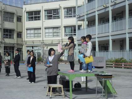 続いて、年間を通して皆勤(病気による欠席・出停のある児童は除く)であった児童の表彰を行いました。昨年度の皆勤は70名でしたが、今年度は、109名の児童が皆勤でした。511名在籍ですので、2割もの児童が皆勤したことになります。元気に登校してこれたことは、素晴らしいことです。表彰状は、6年間通してインフルエンザによる学級閉鎖以外は皆勤であった6年生児童二人が受け取りました。