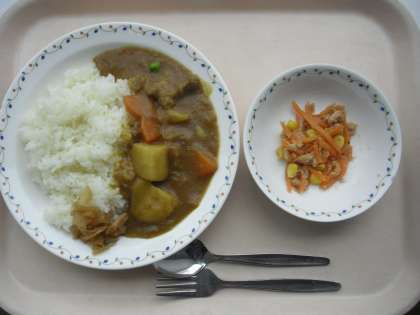 <カレーライス・福神漬・にんじんとツナのサラダ・牛乳>