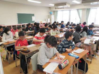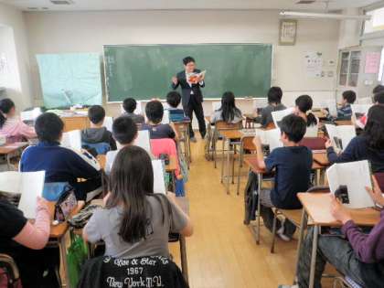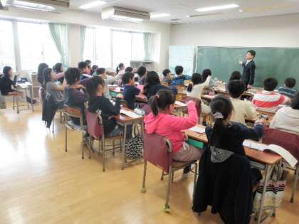 まず初めに漢字ドリルを使った漢字学習の仕方について、説明していました。漢字学習は、6年全体で同じように取り組みます。また、音読の際、本を立てずに読んでいる子に対して、「音読のとき、本を立てて読んでいた子は正解です。」の先生の一声で、あっという間に全員が本を立てて音読を始めました。