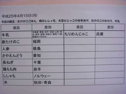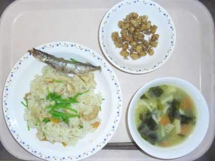 <たけのこごはん・焼きししゃも・大豆とじゃこの甘辛あげ・たけのこのみそ汁・牛乳>