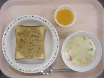 <セサミトースト・コーンシチュー・キャロットゼリー・牛乳>