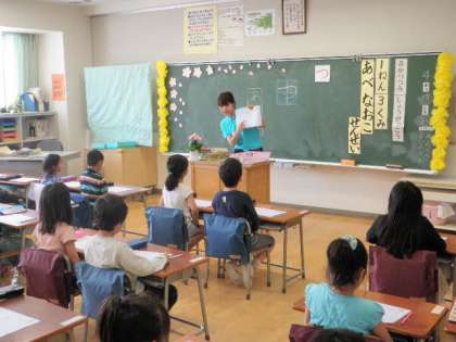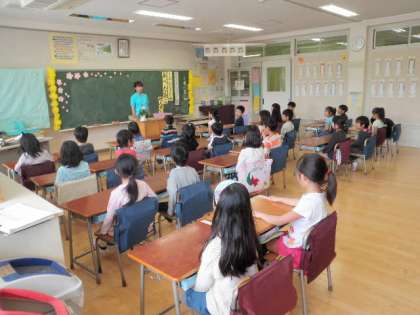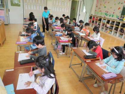 学習の合い間合い間に、「姿勢で教えてください。」という先生の声掛けに、子どもたちは、姿勢をよくすることで、学習が終わったことを示していました。授業の中で、名前を呼ばれたら返事をすることを何度も何度も確認していました。