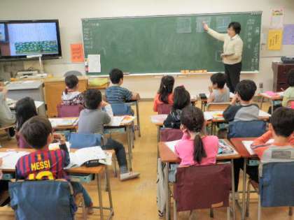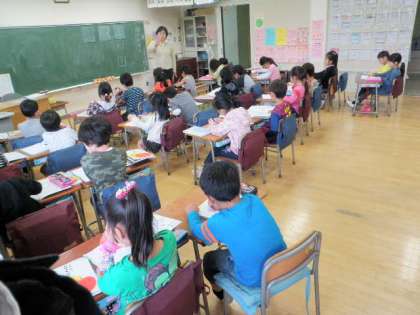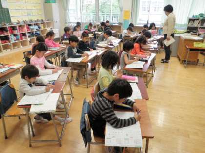 先生の説明をよく聞きながら、集中して漢字の学習をしていました。子どもたちは、先生に指名されると、みんなしっかり「はい」の返事をしてから発表していました。また、音読の前に、おなかに手を当てて、笑いながら、怒りながら、泣きながら、そして最後に、一番上手な2年生の声で「あいうえお」で練習していました。