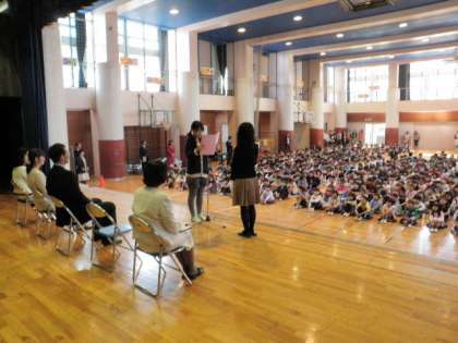 今年度は、7名の教職員が赤堤小学校を去られました。本日は、5名の方がお見えになり、離任式を行いました。子どもたちが心のこもった作文を読み、離任の教職員からお話をいただきました。最後に離任者が各学年の間を通りながら、別れを惜しみました。