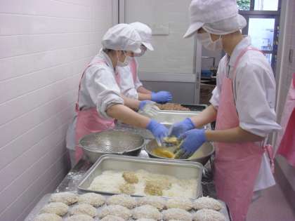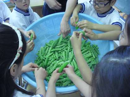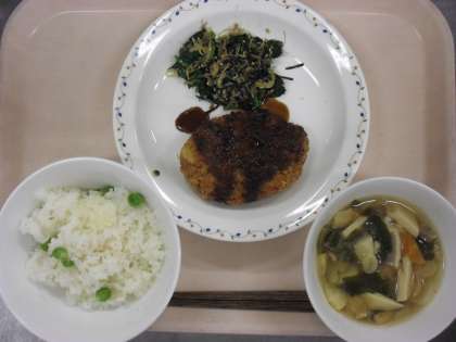 新物の収穫は南の九州地方から始まります。1年生がさやむきをしてくれた今日のグリーンピースは鹿児島県産で、グリーンピースごはんにして食べました。手作りのメンチカツもやわらかく、みそ汁も新たけのこの風味が感じられ、みなおいしくいただきました。