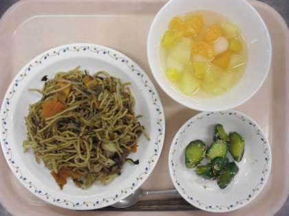 <ソース焼きそば・きゅうりの中華味・フルーツ白玉・牛乳>