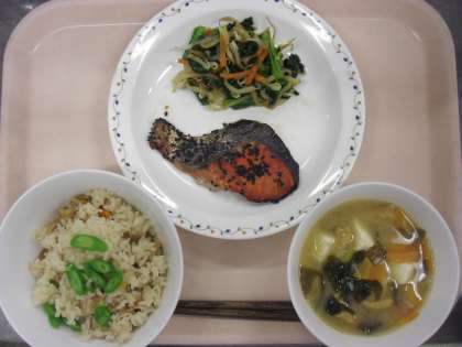 <子ぎつねごはん・鮭の南部焼き・おひたし・みそ汁・牛乳>
