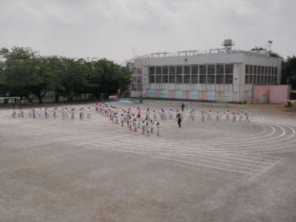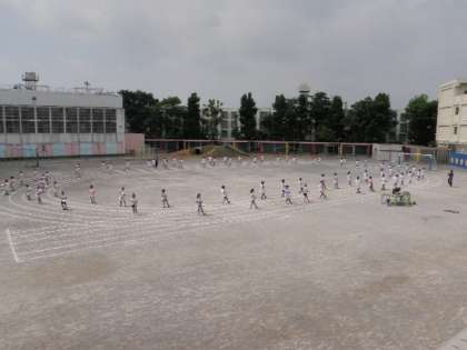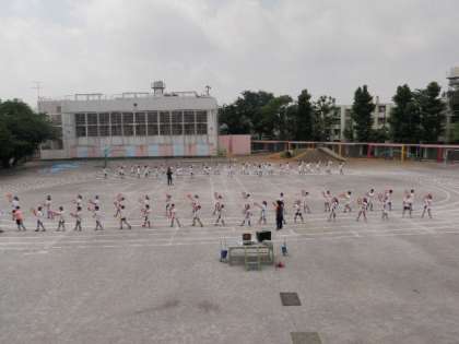 5年生の団体演技は「チバリヨー エイサー」です。今日は、保護者の皆さんに作っていただいた衣装を着ての練習でしたが、みんながお揃いの衣装を着て演技すると、ますます見栄えもよく、迫力がありました。隊形をいろいろと変化しますので、お子さんがどこで踊るか学年だよりをよく見ておいてください。
