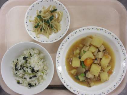 <青菜とじゃこのごはん・新じゃがのそぼろ煮・もやしのごま風味・牛乳>