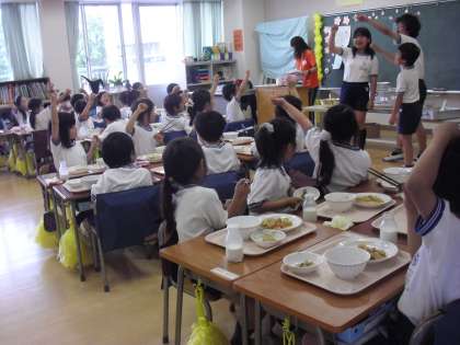 今週の給食時間は、6年生が1年生の教室にきて運動会の応援の練習をしにきています。もうすぐ運動会、気持ちもあがってきているようです。