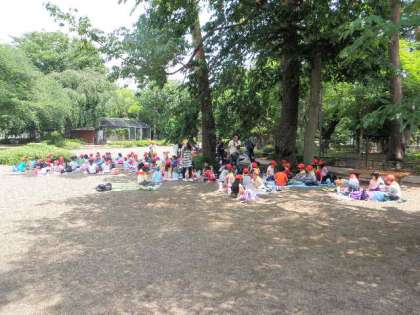 モルモットを抱っこした後、グループごとに動物を見て回りました。11時30分からは、みんなでおいしいお弁当を食べました。何回もお弁当を作っていただきありがとうございました。6月下旬から7月上旬の気温ということでしたが、子どもたちはよく歩きました。