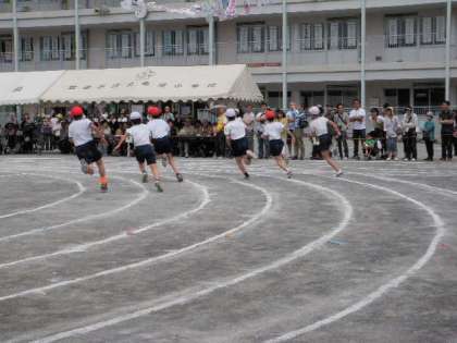 プログラム7番、6年生による徒競走「100m走」。さすが6年生、素晴らしいコーナーワークで走ります。小学校生活最後の運動会です。タイムの近い友達と走りましたので、勝利の喜びを噛みしめている子が見られました。