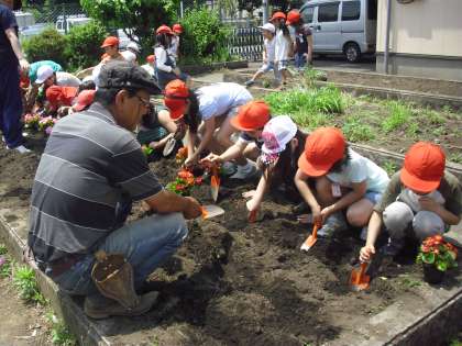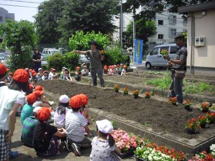区内で花の苗を栽培している園芸農家の方に来ていただき、植え方を教わり、花壇に花を植えました。