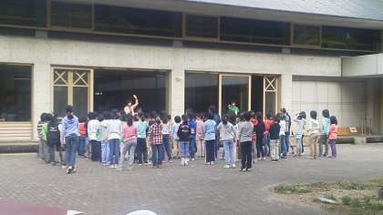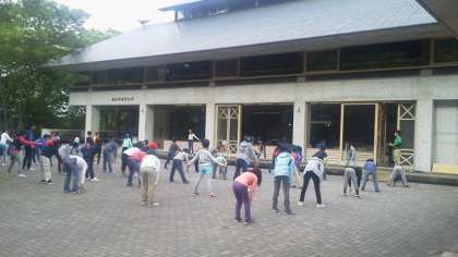 6時半からの朝会の様子です。川場の空は、雲の間から晴れ間が見えます。皆よく眠れたようで、元気です。