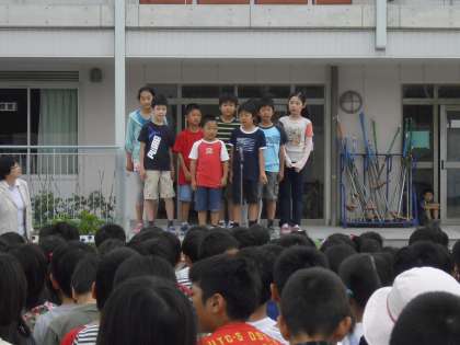 最後に、小陽聖華主任教諭が、5月24日に、地域の方とボランティアの保護者の方の協力をいただいて、ビオトープにほたるの幼虫とタニシを放したことを伝えました。