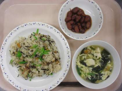 <磯おこわ・かきたま汁・煮豆・牛乳>
