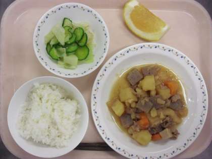☆食材の産地:玉葱(群馬)、じゃがいも(長崎)、人参(千葉)、さやいんげん(茨城)、キャベツ(茨城)、きゅうり(群馬)、ジューシーフルーツ(愛媛)、豚肩肉(群馬)、凍り豆腐(国産)、米(秋田・青森)