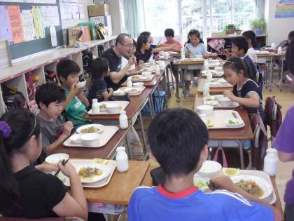 今日は4クラスで国際理解教室があり、給食時間も留学生を囲んで楽しく会食をしました。