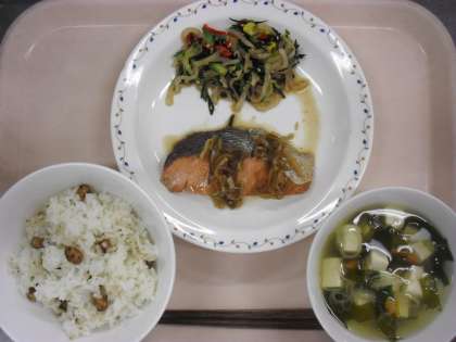 <豆ごはん・鮭の南蛮焼き・大根とひじきのサラダ・すまし汁・牛乳>