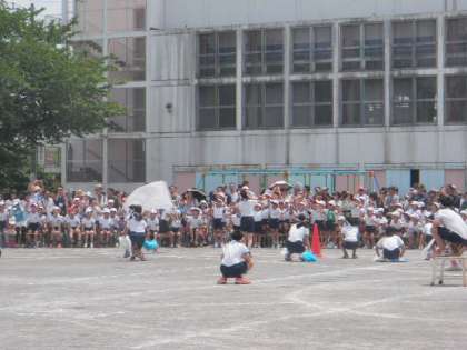 プログラム15番、児童全員による「応援合戦」、午前中最後のプログラムです。今年度から「応援合戦」を得点種目にしましたので、いつも以上に応援団のリードで、力のこもった素晴らしい応援合戦になりました。採点は、来賓の皆様にお願いしました。