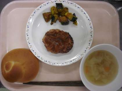 <ミルクパン・豆腐ハンバーグ・かぼちゃのガーリック炒め・野菜スープ・牛乳>