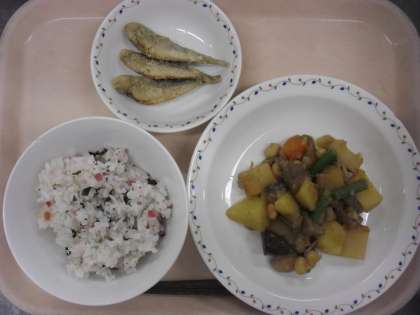 <梅わかごはん・豆入り筑前煮・小あじのから揚げ・牛乳>