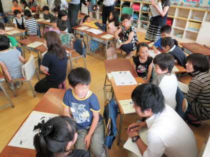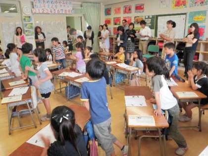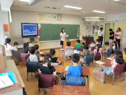 今年度6回目の研究授業です。今日の単元は「季節を楽しもう<2>夏をみつけよう『にゅうどうぐも むくむく』」でした。ねらいは、夏の様子を表す詩を読み、季節を感じることばを探しながら、夏の様子や夏を感じることばを味わう意欲を高めることにありました。子どもたちは二人組で夏を感じることばを出し合いましたので、どの子も自分なりに夏を感じることばを考えることができました。その後、たくさんの子どもが発表し、黒板の「しゃぼんだまっぷ」は、夏を感じさせることばでいっぱいになりました。
