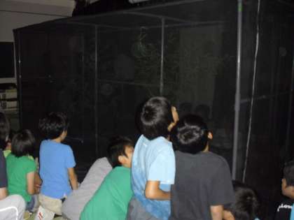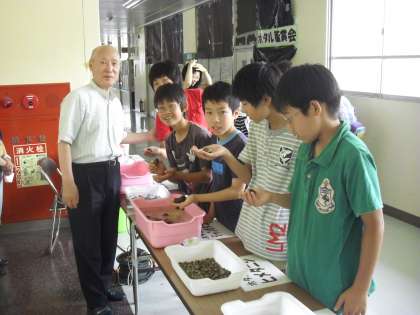 部屋を暗くし、前日の午後6時から、朝の7時まで、蛍光灯を点灯させてから、部屋を真っ暗にすると、ホタルが光ります。その様子を、1年生と5年2組と6年3組が、クラスごとに鑑賞しました。