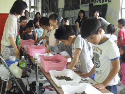 部屋から出た後は、ホタルの幼虫やホタルのえさである数種類のタニシを観察しました。