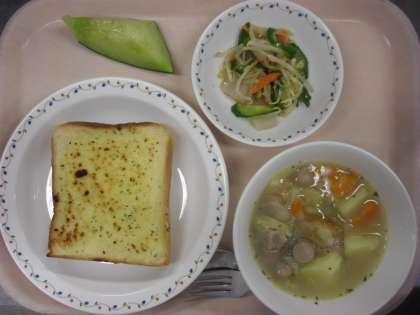 ★給食室リクエスト<ガーリックトースト・ポトフ・こんにゃくサラダ・メロン・牛乳>