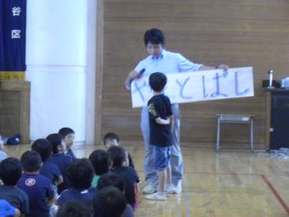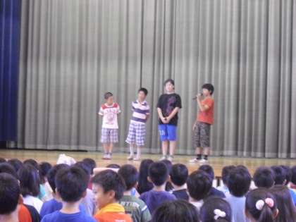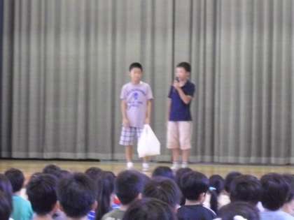 最後に環境委員会の代表児童が、今週からはじまったエコ週間について話しました。自分たちのできることとして、「ごみの分別をしよう」と呼びかけました。